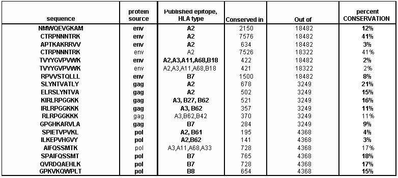 Peptides shown in this table are published CTL epitopes that are highly conserved across clades and strains of HIV-1. They were identified by evaluating HIV-1 sequences for conserved regions, and then comparing these regions to EpiMatrix MHC binding motifs. This list of highly conserved potential MHC binders was then compared to the list of published HIV-1 sequences on the Los Alamos National Laboratory HIV-1 Sequence Database. This is only a partial list of the published epitopes containing conserved HIV-1 sequences.